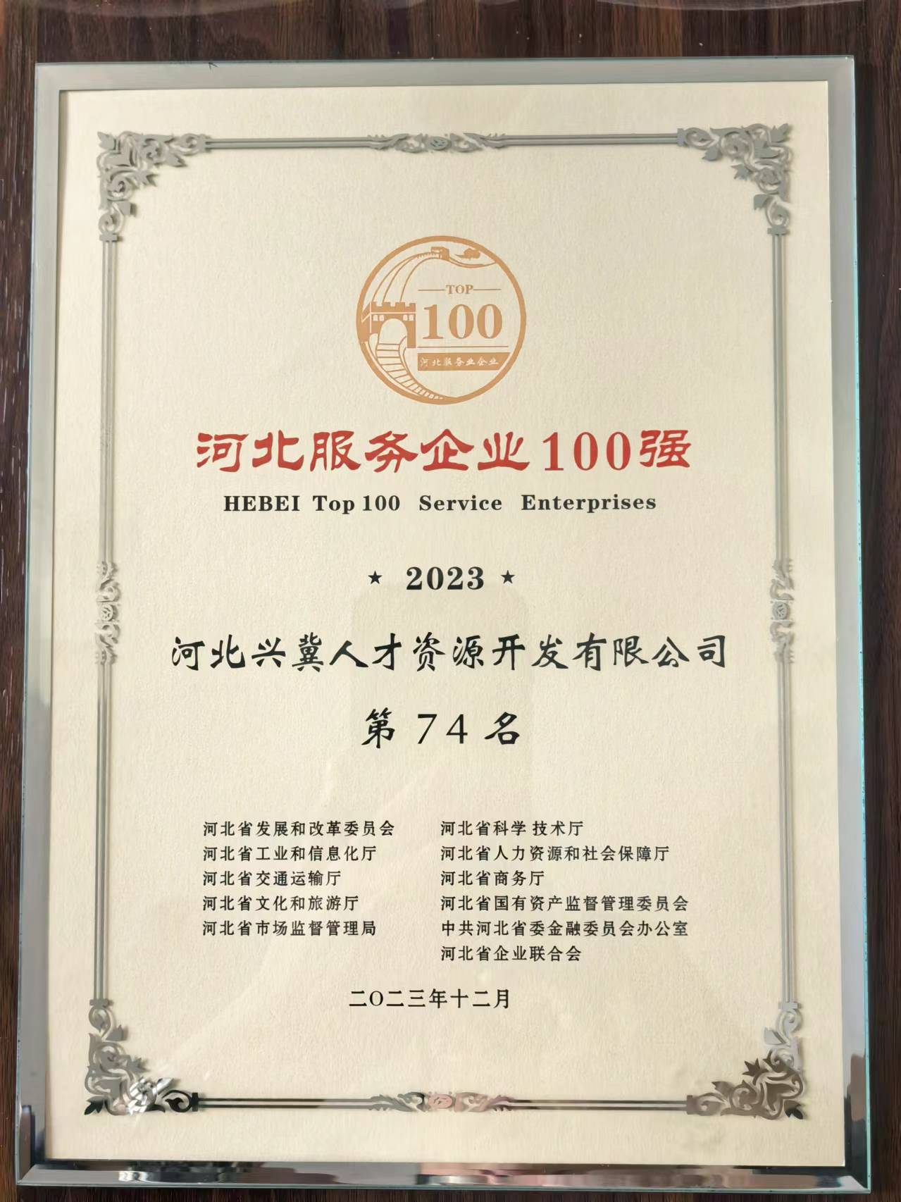 為發(fā)揮服務業(yè)龍頭企業(yè)示范帶頭作用,深化改革創(chuàng)新,加快構建優(yōu)質高效的服務業(yè)新體系,推動全省服務業(yè)高質量發(fā)展,省發(fā)改委、省國資委等11部門聯(lián)合開展“2023河北服務業(yè)企業(yè)100強和創(chuàng)新領先50強”評選工作。興冀人才公司成功入圍“2023河北服務業(yè)企業(yè)100強”榜單,公司經(jīng)營發(fā)展成效及業(yè)務服務水平獲得業(yè)內(nèi)外一致認可。